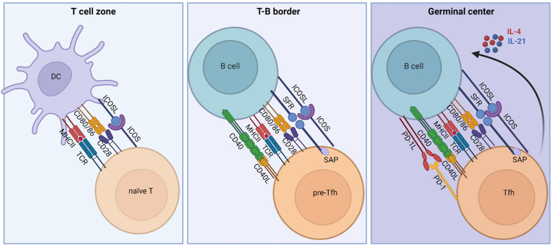 Tfh与B细胞的相互作用:Tfh 细胞产生 IL-4 和 IL-21,从而为 B 细胞提供支持